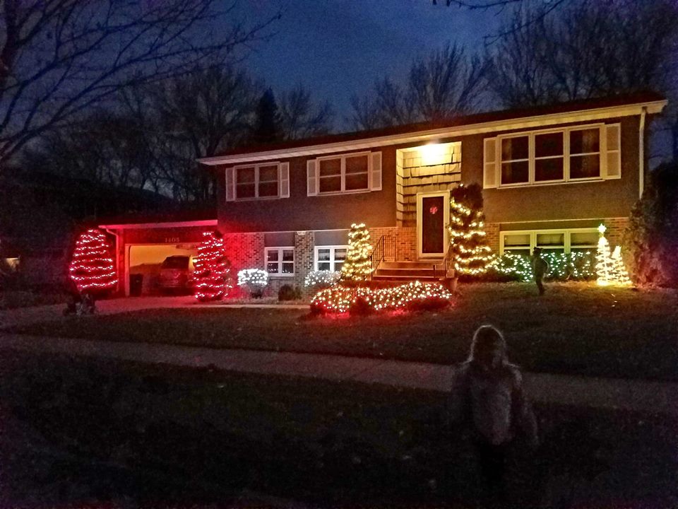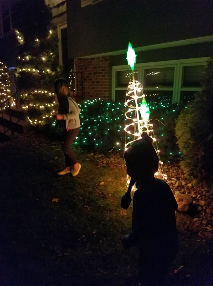 Later when Josh was home from work we all went on a walk–each kid in a stroller–like was our routine almost every nice afternoon at that time. We had plugged in the lights to a timer to make sure it all was wired right, and set it so they’d be on when we got back. As we got closer we all were anticipating seeing it (some showed their excitement more than others 😉)…and then we turned the corner! It looked a little Grizwold-y, with mismatched types of lights and un-coordinating colors, but it dazzled the kids. And they got out and stood there in awe.