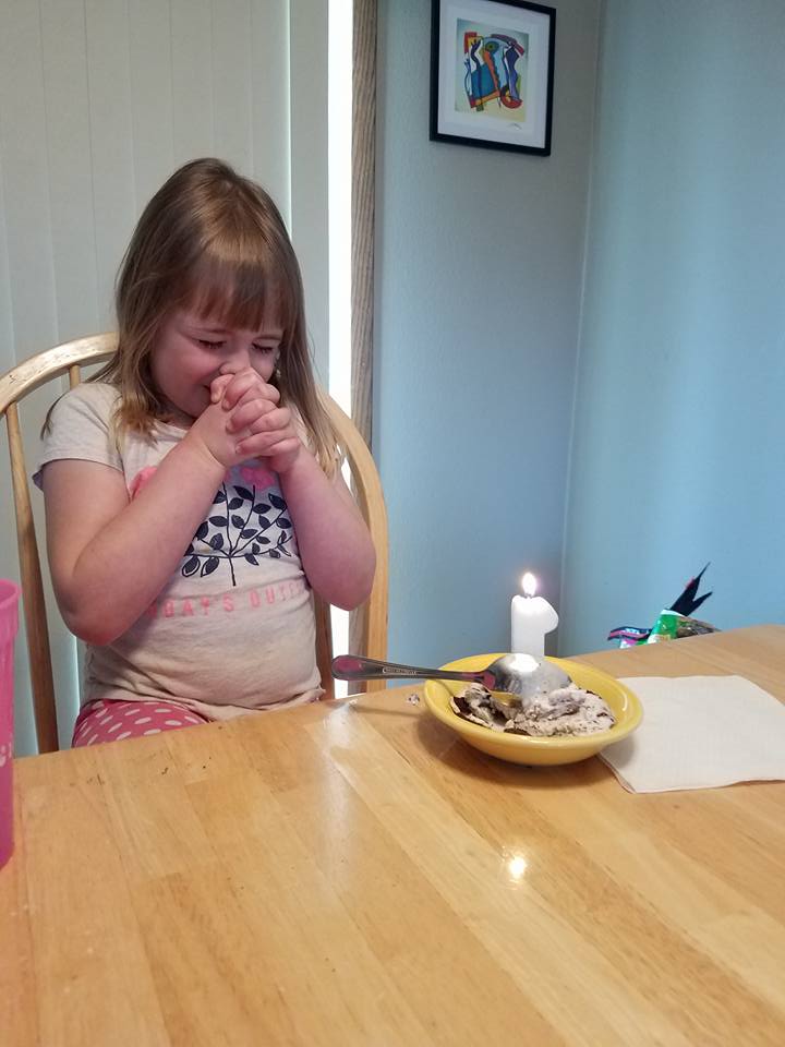 We put a candle in oreo ice cream for dessert (he liked Oreos too), and said Molly could blow it out.  We sang to Drew, and Molly really folded her hands like this at the end, and then blew it out.  She immediately said, “You know what I wished for?  That Drew could be with us everyday, even if he’s in Heaven.”  Oh, if I couldn’t get my first wish of having him back, that would be my second Miss Molly!