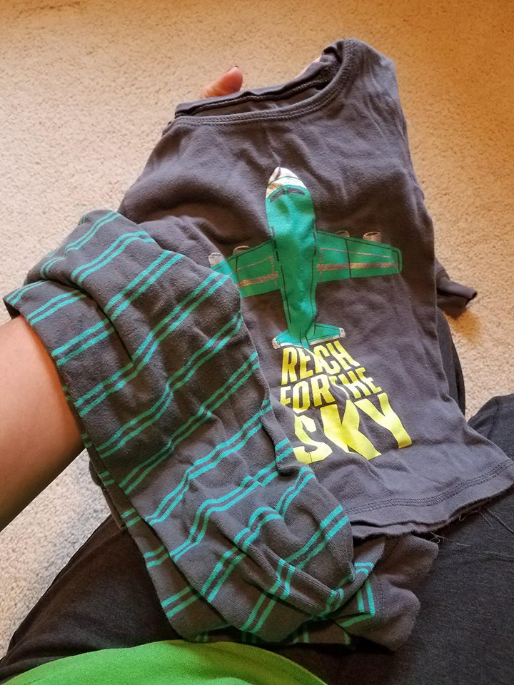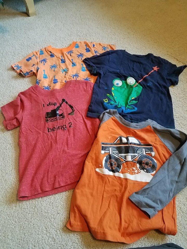 It’s like they are a part of him.  The red “I dig being 2” shirt was a birthday gift–on his last one.  And he wore that shirt A LOT.  The orange and gray monster truck shirt he wore while he sang Jingle Bells in a video I still watch just to hear his voice.  And the bright orange shirt with the palm trees and guitars, his “gee-tar shirt” as we called it (top left), was a part of so many memories, one of my favorites.  So familiar to us, and I’d be willing to guess to others too who saw him in it regularly or in pictures.