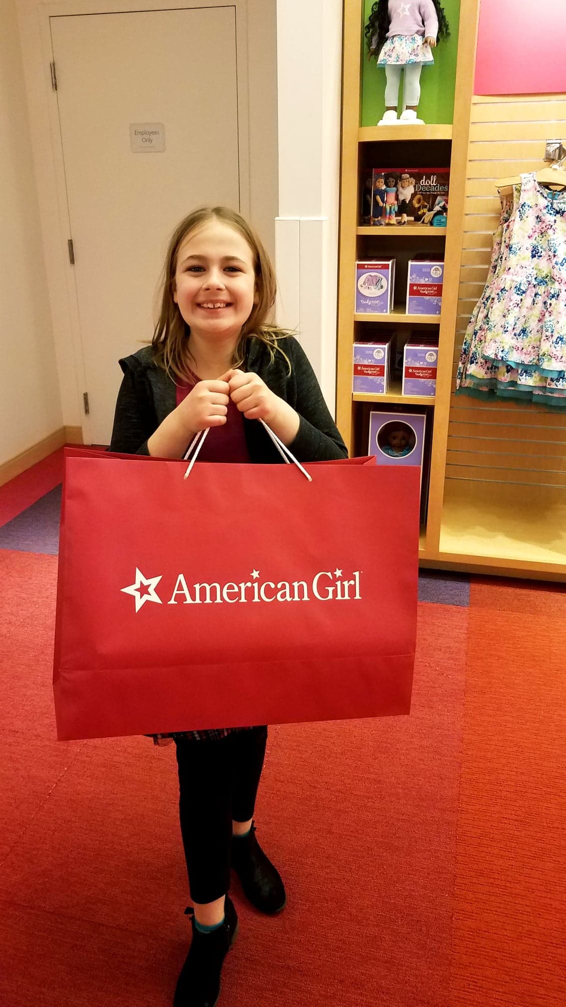 Then we walked across the street to the American Girl Doll store on Michigan Avenue. Molly had on her Christmas/Birthday list a *real* American Girl doll, not another brand’s version. Being the practical folks many know we are, we gifted Molly the money for half of the doll at her birthday and told her like last year’s Lego set, she could earn the other half by saving her money from her paid chores, and by picking up extras. We hoped to teach her the value of $100, and of working for something you really want.