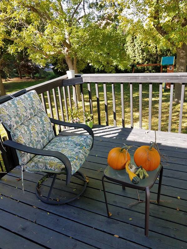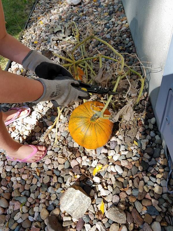 Finally it was time to cut those pumpkins off the vine we decided, to display them on our deck. Our prize for the whole season of work. To showcase the amazing process that took place from when we planted our tiny pumpkin seeds, to the huge plant they became, and the brilliant pumpkins that were produced.