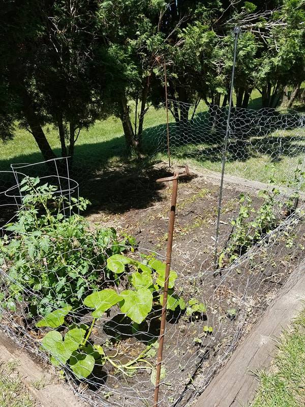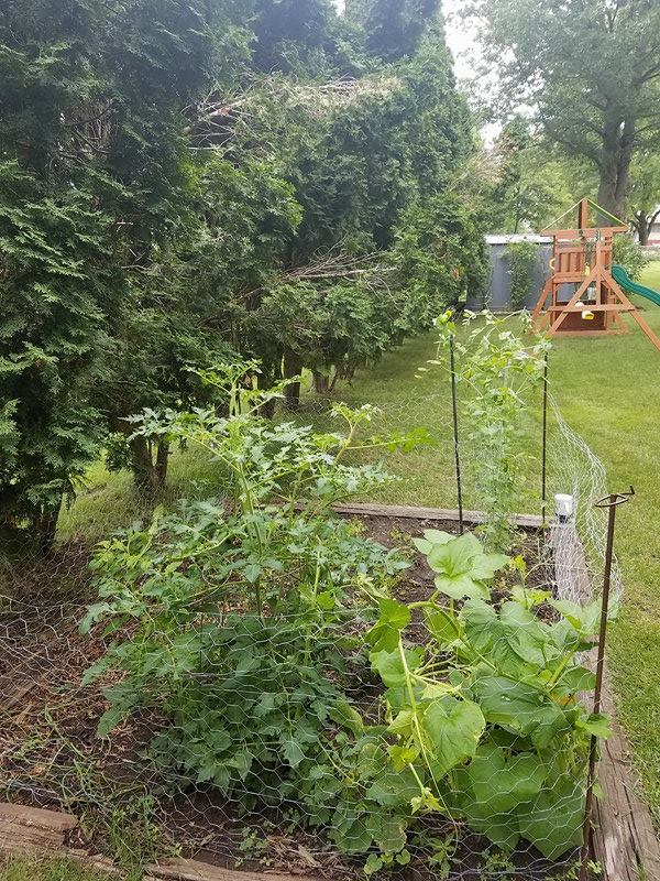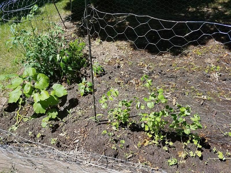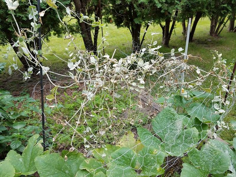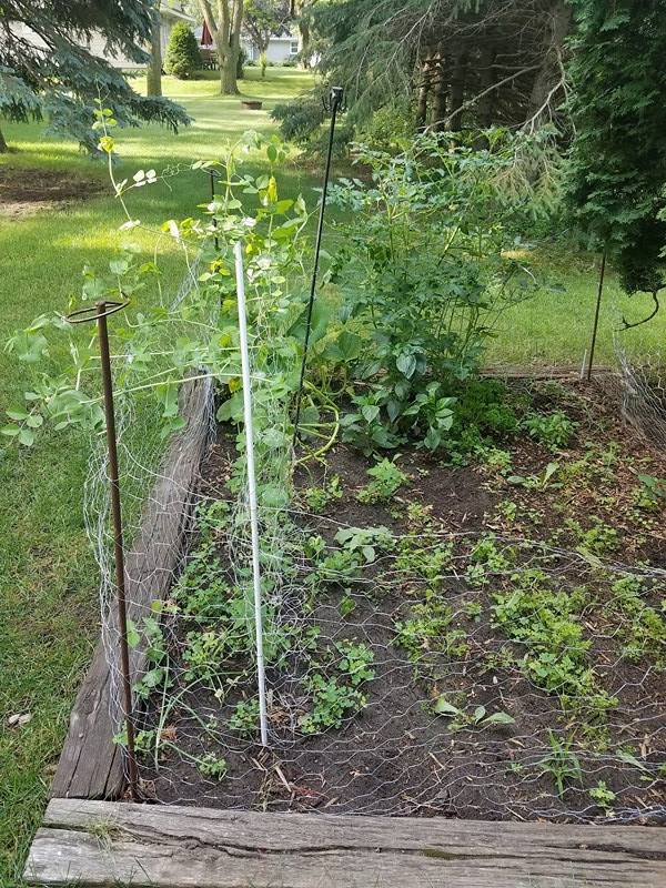 Back to the garden, the peas were getting really tall, flopping over! Do they need a cage like the tomatoes did? I looked it up–yes! They are suppose to grow on a trellis! What did I have for that?? I looked around in the shed again. I could use the rest of my 3 foot chicken wire just stretched out between the rows of peas. I got it all rigged up and the peas grabbed right on and grew tall! More mid-game adjustments, but we were cookin’ along!