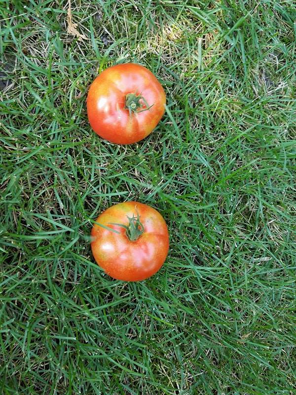 As we got deeper into the Summer, the tomatoes finally started coming too, and more pumpkins started to grow. A few would start along the vines, but since they all were now outside of the fence, some would get eaten up or torn apart from animals.