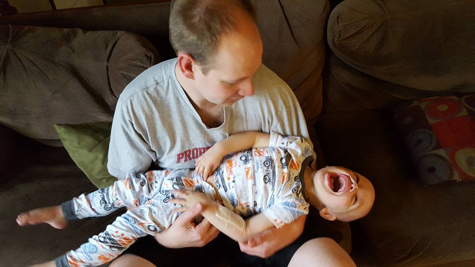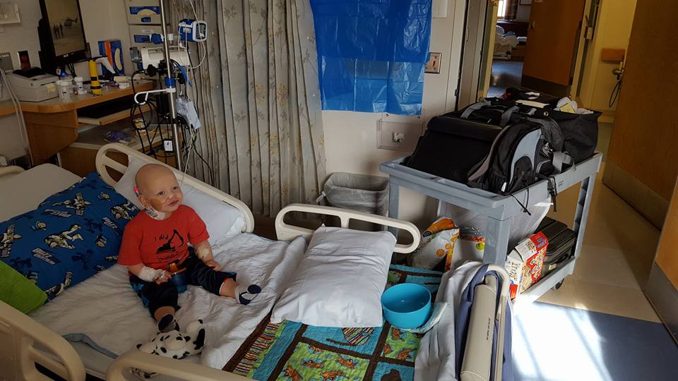 It was about a year ago that we went through a really tough week.  I said at the time it was one of the worst weeks of my life, and I still think it is in the top 3 behind only when we found out the cancer was back, and our last week with Drew.  We were in the hospital, waiting for his counts to come up to collect stem cells for the transplants.  He was having bone pain from the shots we had to give him each night to stimulate his bone marrow to recover.  His central line was out due to a previous line infection, so each blood draw at 4:30AM had to be done the old fashioned way, leaving his veins bruised.  They had already placed the catheter in his neck from which they’d filter his stem cells out of his blood when it was ready, making him not able to bend his neck to that side.  And to top it off, he had an IV blow a vein and fill his arm with fluid to the point where his hand was blue and his skin on his forearm was blistering.  It was a rough week.  Here he is from that week, looking like he’s been through a war.
