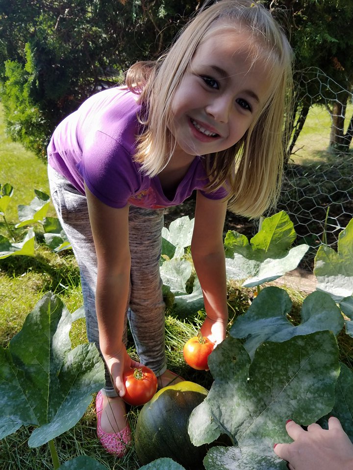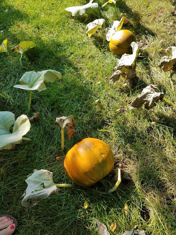 We are watching our first garden finally produce crops–tomatoes and pumpkins that are finally starting to turn their vibrant red and orange colors: